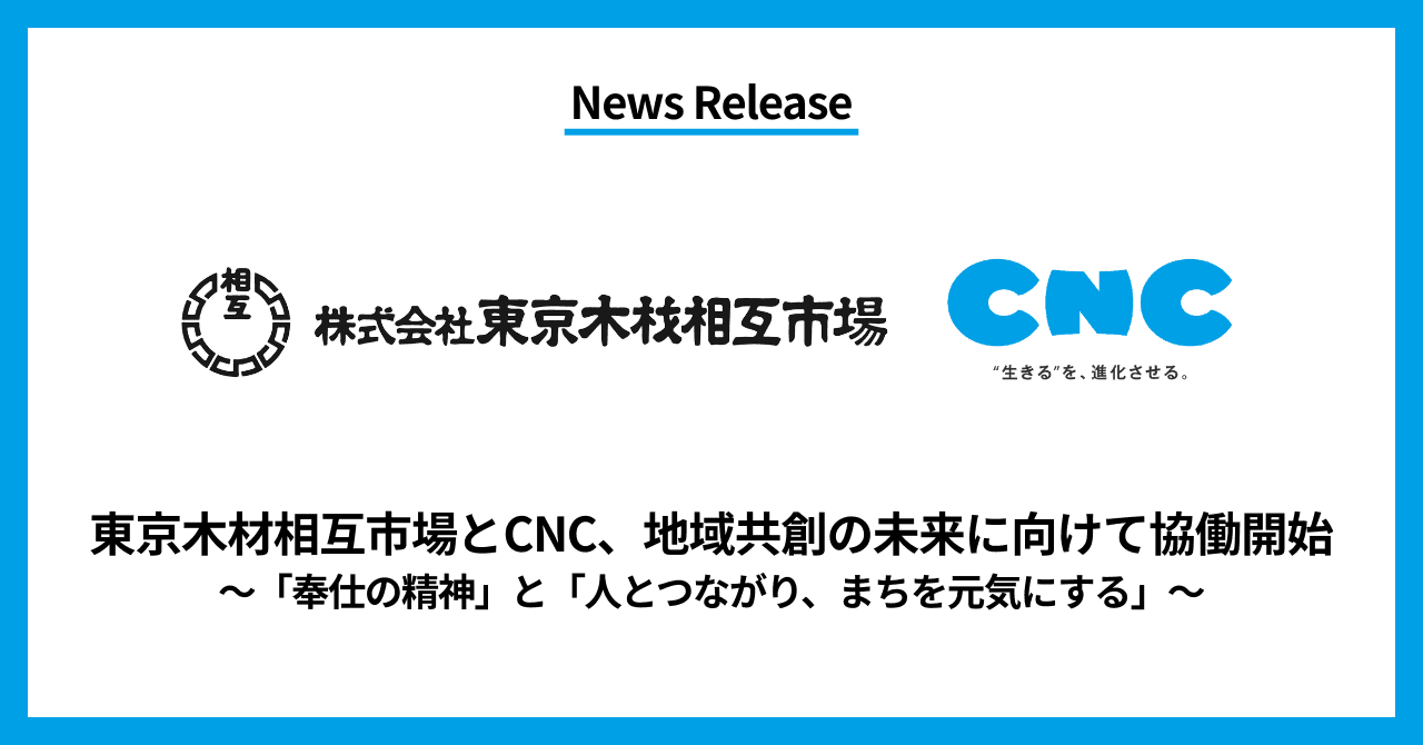 株式会社東京木材相互市場(本社:東京都練馬区、代表取締役社長:西村信洋、以下、東京木材相互市場)と株式会社 CNC(本社:島根県出雲市、代表取締役:矢田明子、以下、CNC)は、「地域への貢献」×「企業の新しい未来創造」を共通テーマに、コミュニティナースの実践知を企業活動へ接続する協働の取り組みを開始しました。